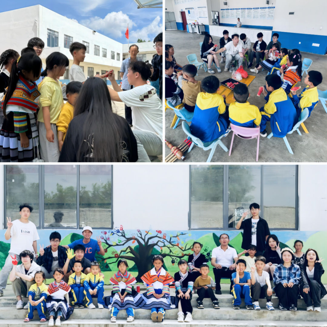 实践过程中,党员实践队邀请了学生们一同参与本次墙绘绘制,用小手为校园增添色彩。期间,实践队以“民族团结一家亲”为主题,以通俗易懂的语言向学生们讲述了在中国共产党领导下全国各民族团结、全社会人民生活水平提升的发展成果,引导、呼吁孩子们要爱党、爱国,要努力学习、立志将来为祖国作出贡献。在队员们引导下,孩子们自信展示了自己的民族乐器、吹响了民族音乐、跳起了民族舞蹈、畅谈了自己的“大”梦想,最后将自己的“小手掌”在“共荣”的大树上印下了自己的“大愿望”。