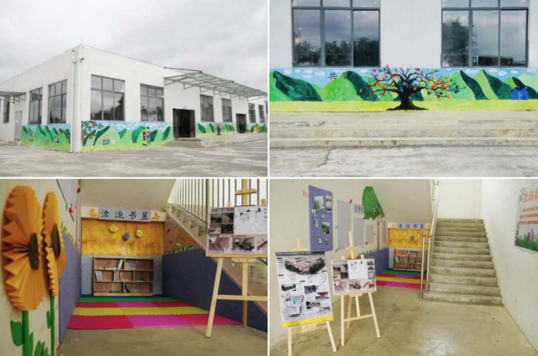 为进一步助力地区教育振兴、建设校园文化、为校园营造浓郁的学习氛围,实践团队在广泛调研、访谈的基础上,结合专业知识,对锅圈岩乡平坝小学公共空间进行合理规划分区,设计了集运动、休闲、文化交流于一体的校园规划设计图;团队成员全员参与、完成了对校园文化墙、宣传栏及“漂流”阅读角的设计和微改造。