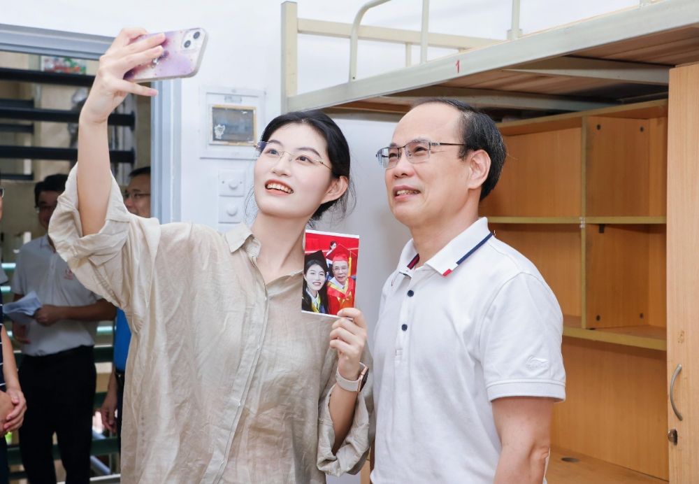 “校长,可以合个影吗?”在各学院迎新站点,不时有学生向广工校长邱学青“求合影”。邱学青欣然接受,与新生、工作人员合影交流,并寄语新生:“ 大学是一个全新的舞台,你们要比以前更加努力,才能绽放夺目光彩。希望你们在广工学有所得、学有所成,努力成为德智体美劳全面发展的社会主义建设者和接班人。”