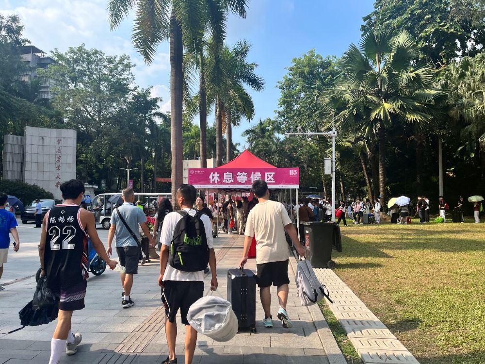 在新生报到时,一人入学、全家出动的情景也不少:许多学生、家长拎着大包小包走在路上,有些学生和家长在迎新招牌前合影留念,有的特地前往学校特色景点“打卡”……新生们朝气蓬勃的脸上,满是对学校与大学生活的好奇与期待。学校还在小五山宿舍安排床位,为有需要的家长免费提供过夜住宿。