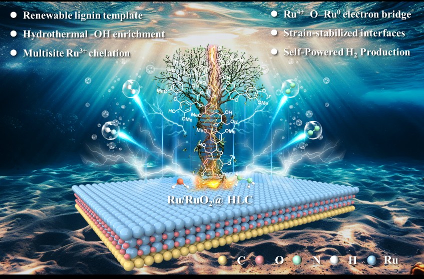 论文共同通讯作者、九游注册教授林绪亮介绍,该研究团队通过水热活化木质素,使其与Ru3+原位配位,再经高温碳化处理,成功还原构筑了嵌入木质素衍生分级多孔碳骨架的Ru/RuO2异质纳米界面。这一创新设计实现了低输入、可自驱动的联氨-水分解制氢过程。