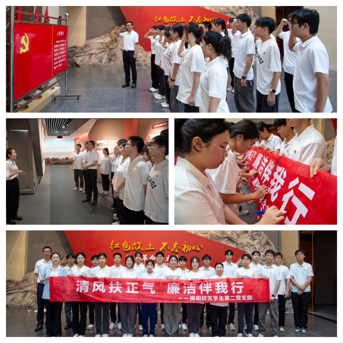 为深入学习贯彻习近平总书记关于党纪学习教育的重要讲话和重要指示精神,促进党员传承革命精神和优良作风,把纪律规矩转化为政治自觉、思想自觉、行动自觉,5月25日,揭阳校区学生第二党支部举行“党规党纪记心间,奋勇攀撑创未来” 红色研学主题党日活动。校区师生党员、团学骨干共25人参加活动。
