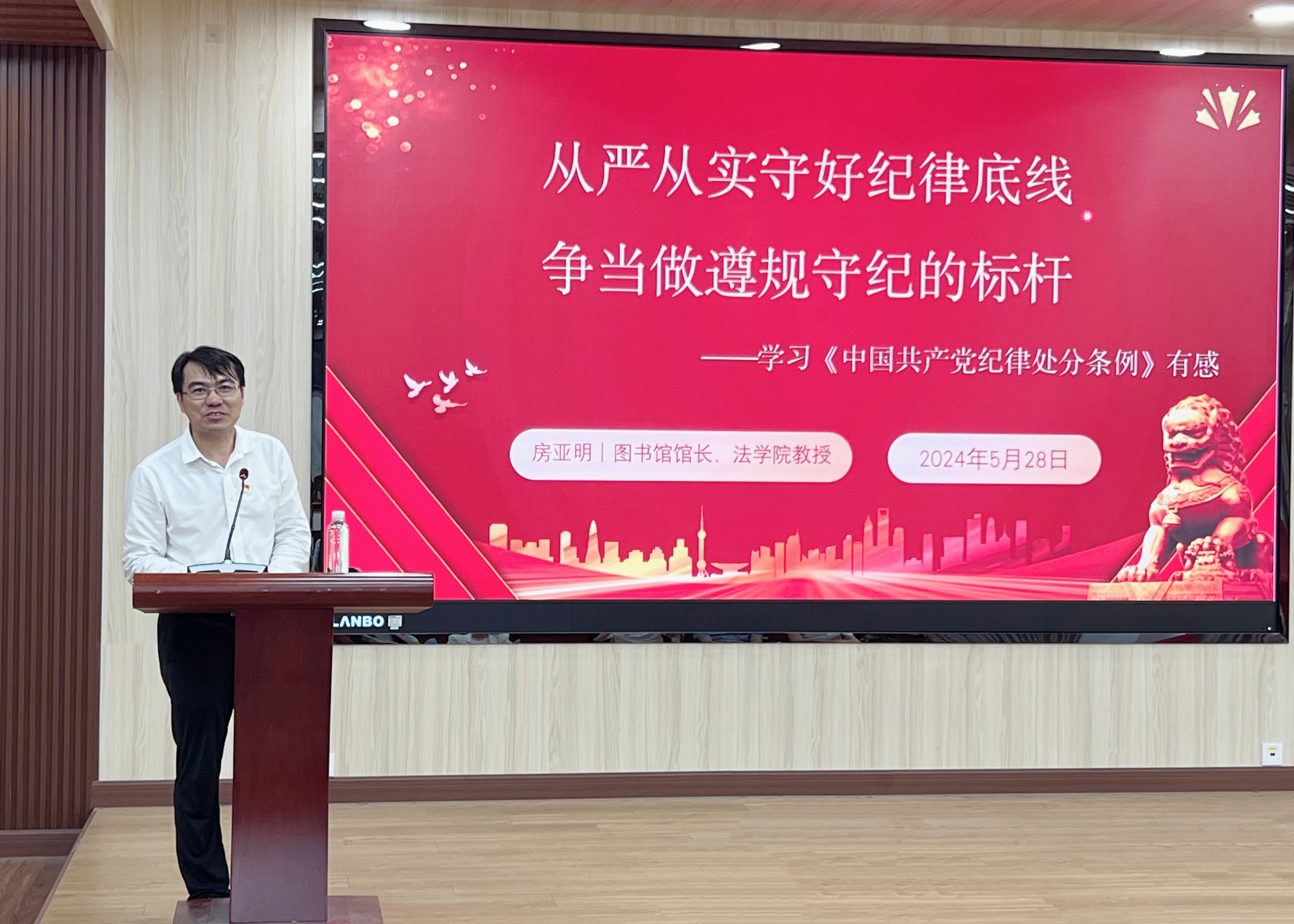 为深入学习贯彻习近平总书记关于党纪学习教育的重要指示批示精神,教育引导党员学深悟透《中国共产党纪律处分条例》,我院党委于5月28日下午在工三208召开党纪学习教育专题学习会,邀请学校图书馆馆长房亚明教授作党纪学习教育专题辅导报告。会议由学院党委书记周东斌主持,学院全体教师党员、学生党支部书记及博士生党支部支部委员参加会议。