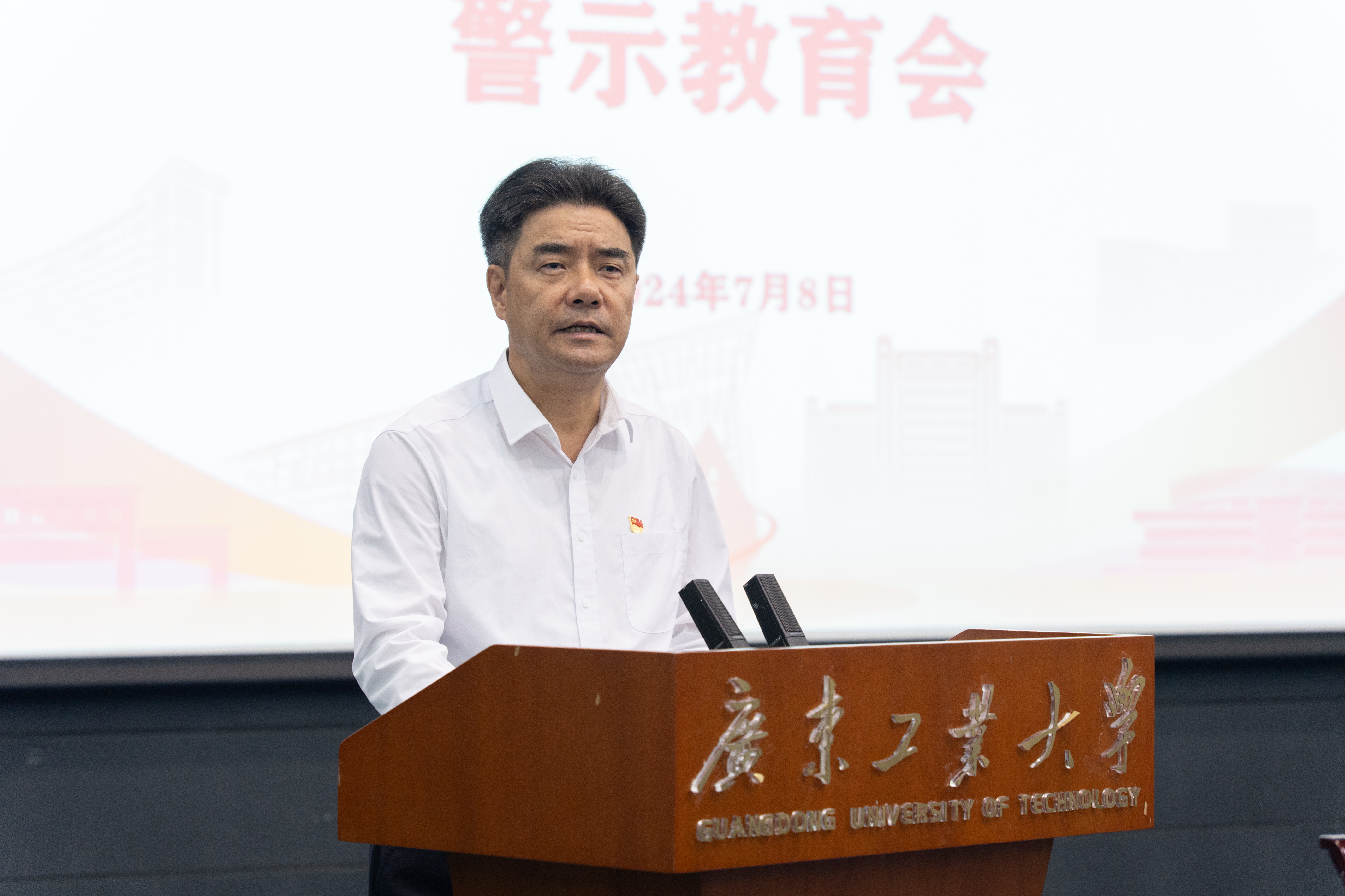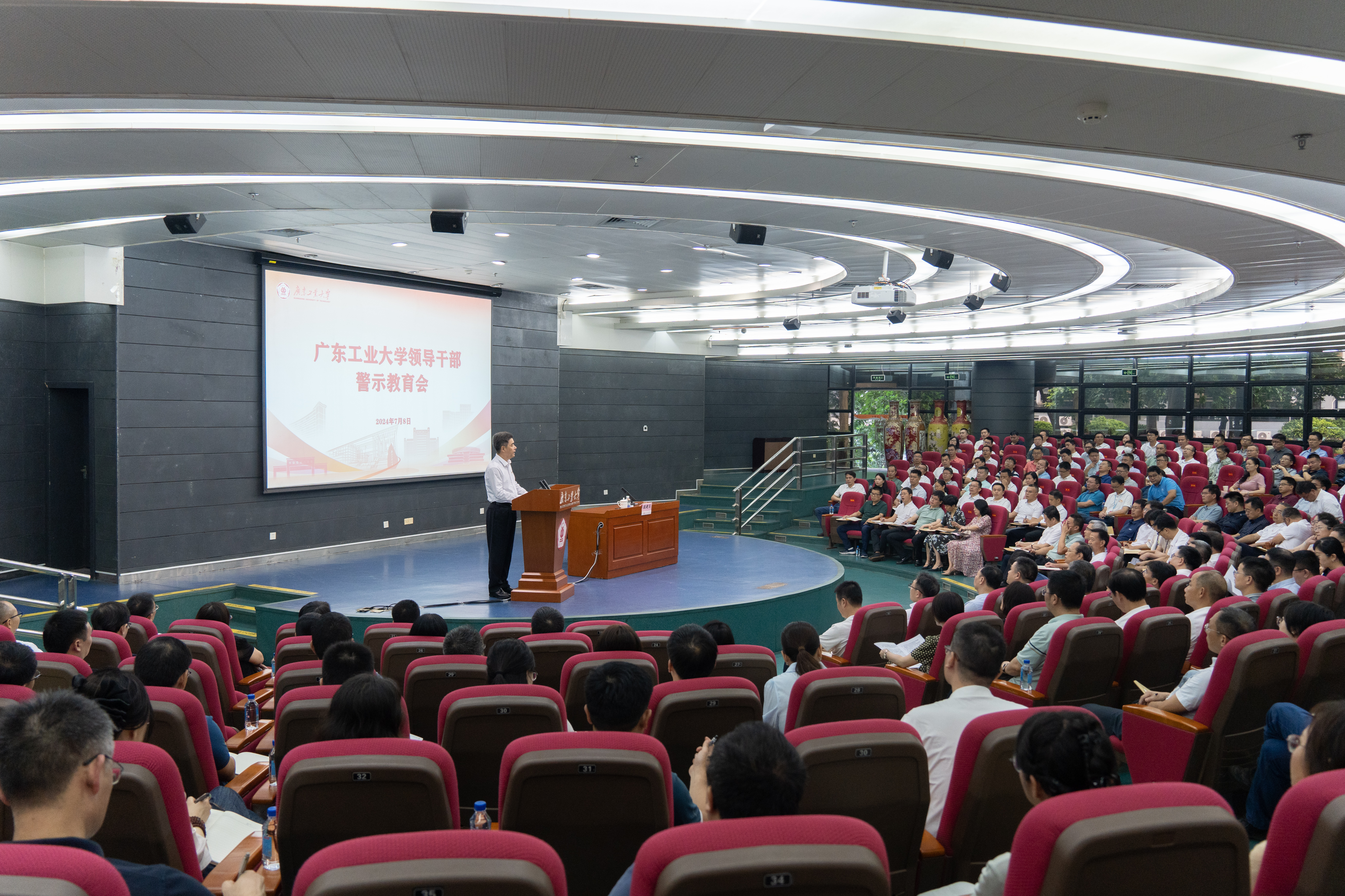庞建国围绕“深入学习领会习近平总书记关于党的自我革命的重要思想 做学纪知纪明纪守纪知行合一的表率”主题作警示教育辅导报告。结合近年来高校领域发生的违纪违法案例,从“六大纪律”逐项剖析领导干部严重违纪违法的表现及危害,要求各级领导干部深入学习领会习近平总书记关于党的自我革命的重要思想,在学思践悟中深刻领会把握加强党的纪律建设的重大意义,明纪知耻,警惕前车之覆,做到心有所畏、言有所戒、行有所止,切实修好知行合一的共产党人“心学”,做守纪知止、勤廉奉献的模范,以严明纪律护航高水平创新型大学建设的广工实践。