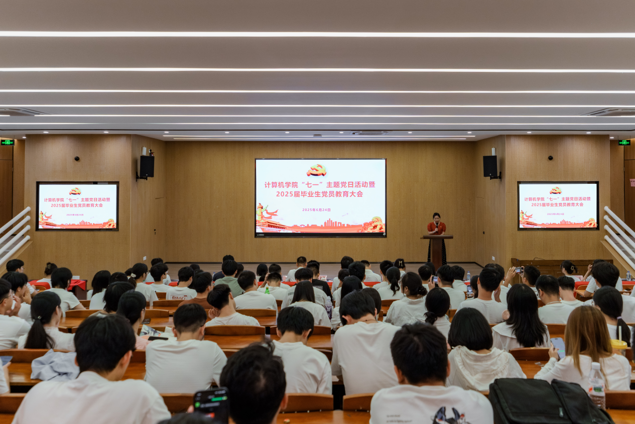 为深入学习贯彻习近平新时代中国特色社会主义思想,扎实推进深入贯彻中央八项规定精神学习教育,全面贯彻落实习近平总书记关于加强党的作风建设的重要论述,进一步强化全体党员责任担当意识,激励全体党员永远跟党走、建功新时代。在建党104周年即将到来之际,计算机学院党委于6月24日下午在工学一号馆学术报告厅举行“七一”主题党日活动暨2025届毕业生党员教育大会。学校纪委办公室主任谭娅、学院党委书记杨文新、党委副书记胡静、师生党支部书记代表、辅导员、2025届全体毕业生党员和2025年上半年新发展党员参加本次大会。大会由胡静主持。