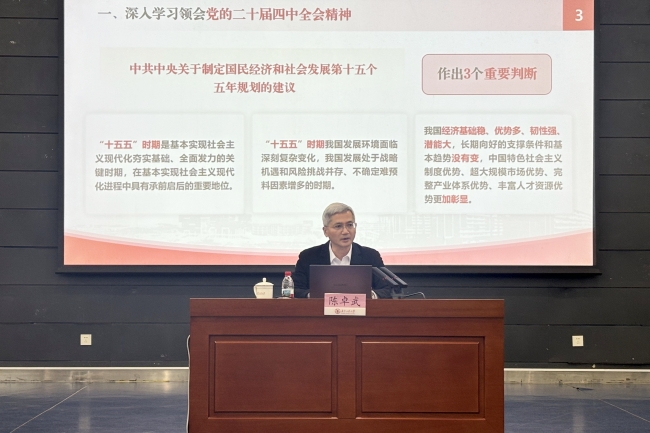 陈卓武以《推动构建人类命运共同体——学习贯彻党的二十届四中全会精神的思考与感悟》为题开讲,结合《中共中央关于制定国民经济和社会发展第十五个五年规划的建议》内容,全面介绍了党中央对“十五五”时期作出的重要判断、提出的“十五五”时期经济社会发展应遵循的指导思想与原则要求,主要的工作目标与任务部署等,还围绕“推动构建人类命运共同体”这一主题,深入分析了“十五五”期间我国发展面临的战略机遇期,介绍了“十个坚持”、“推动构建新型国际关系”、共建“一带一路”倡议以及“推动构建人类命运共同体”等习近平外交思想相关重要内容,并就如何提升学生教育管理水平提出三点意见:一是提高开展区域国别研究的能力,二是引领学生继承弘扬中华优秀传统文化中“胸怀天下”的家国情怀和文明抱负,三是多措并举培育培养学生的国际视野和全球胜任力。辅导报告思想深远、内容丰富、视野开阔,既有理论高度,又有实践深度,对全体学工干部全面学习领会党的二十届四中全会精神具有很强的指导作用。
