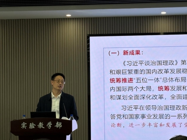 会议邀请学校马克思主义学院院长揭晓教授作辅导报告。揭晓以《以中国式现代化全面推进中华民族伟大复兴——学习〈习近平谈治国理政〉第五卷》为题,从三个维度展开深入讲解:一是系统解读《习近平谈治国理政》第五卷的核心内容与精神要义;二是聚焦“十五五”规划的重点任务与战略举措,结合高等教育发展实际解析政策导向;三是阐述如何学习用好《习近平谈治国理政》第五卷,切实增强“两个维护”的政治自觉和行动自觉。